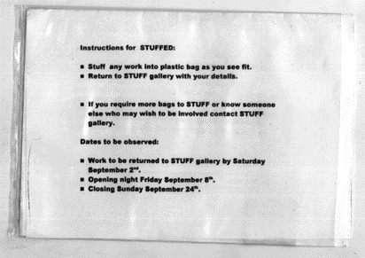 STUFFED will include a gallery curated exhibition as well as the eagerly awaited art-in-a-plastic-bag show received from artists based near and far. Artists have been invited to stuff a small plastic bag with whatever they see fit, and the results of these stuffings will be exhibited in the gallery.